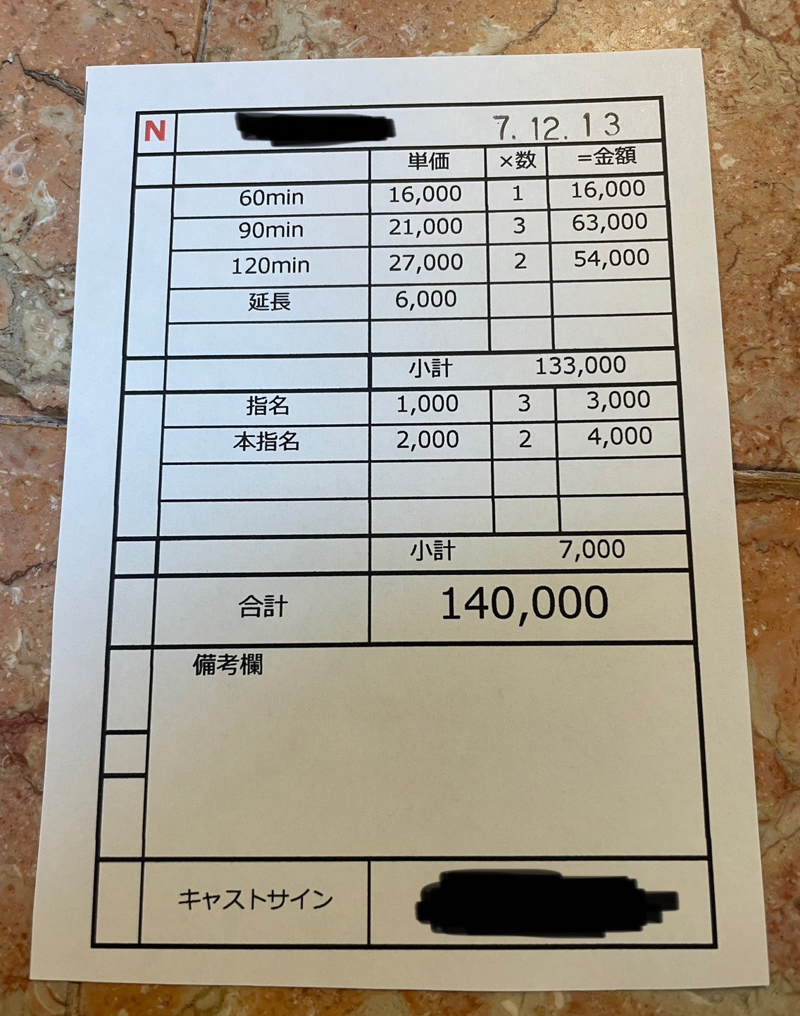 雑費、寮費は6日間のトータルになります。